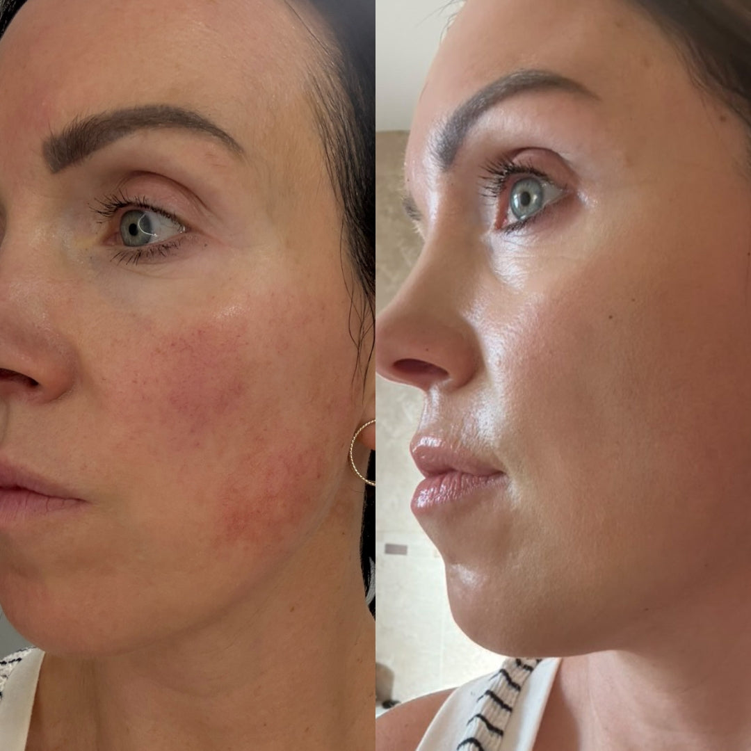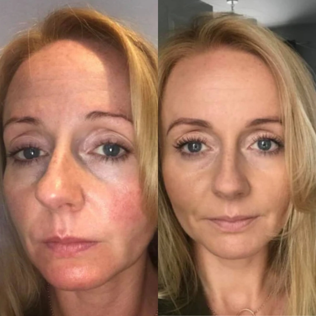 Apply the Rosalique 3 in 1 Anti-Redness Miracle Formula SPF50 to clean skin and gently blend using our Miracle Brush.